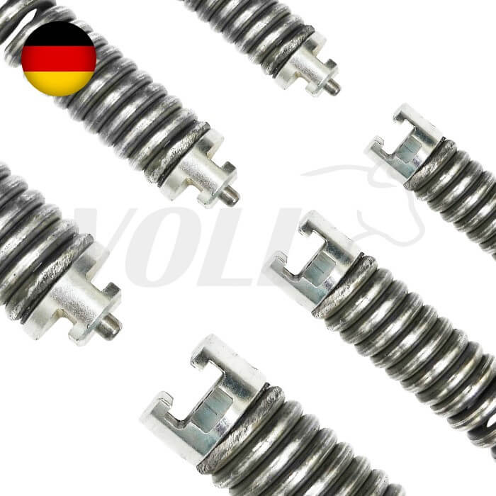 Эта спираль используется, преимущественно, для сложных прочистных работ, например, резки корней, для использования с фрезой и цепью. На прочистной спирали установлен универсальный Т образный замок, обеспечивающий надежное сцепление спиралей между собой или с насадками.